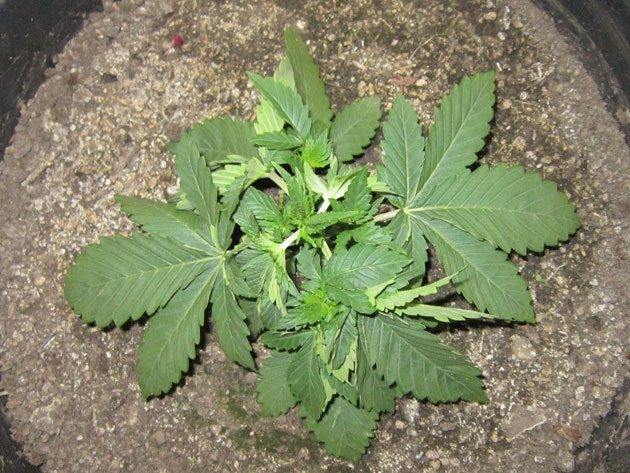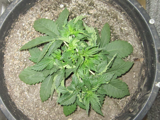 На второй день пятой недели я перевел режим освещения на 12/12. Провел тщательную работу с растением: существенно подстриг листву и проредил куст, удалив примерно половину зеленой массы, однако сохранил некоторые нижние листья для поддержания баланса. Система полива была настроена на подачу двух литров воды каждые два дня, используя слабый питательный раствор буйских удобрений в концентрации 5 миллилитров на литр. После проведенной дефолиации растение продемонстрировало отличную регенерацию и возобновило активный рост.