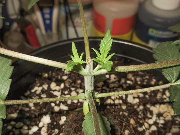 На четвертой неделе еще один переезд, на этот раз в 15-литровые эйр-поты, финальный. Дав растишкам пару дней на восстановление, начал тренировки. Обрезал все, что выше третьего этажа, а ниже удалил зачатки побегов, оставив только лопухи. В месте обрезки быстро образовались две новые точки роста.