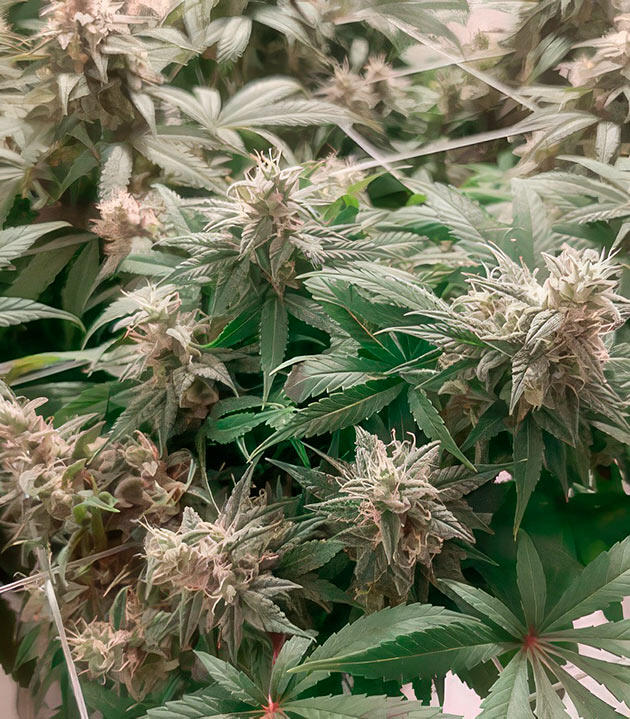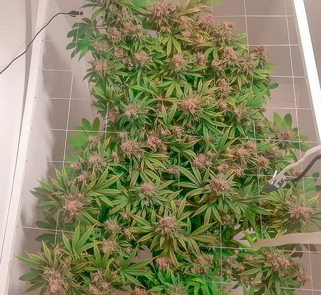 В начале девятой недели провел небольшую дефолиацию — удалил четыре лишних листа. На 59-й день передвинул под сеткой центральный побег, но в целом растение все еще выглядело маловатым для перехода на цветение. Обычно на этом сроке я уже ставлю фотикам режим 12/12, но здесь решил дать Гуле немного больше времени. На тот момент выше сетки пробивалась только центральная ветка и еще одна с противоположной стороны. Планировал завершить цикл «удобрения + чистая вода» и только затем переводить на цвет.