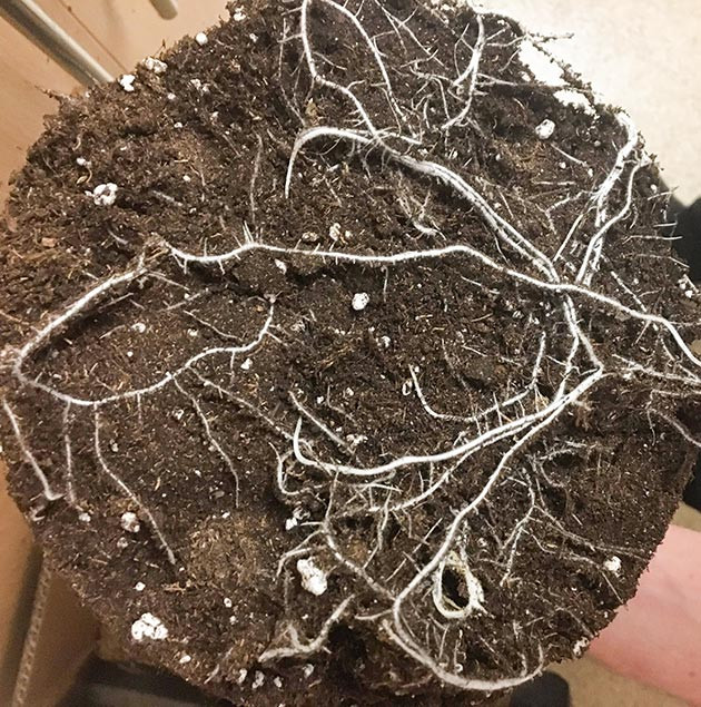 На четвертой неделе выращивания пришло время пересадки растения в новый, больший горшок объемом 11 литров. Во время осмотра корневой системы мне совсем не понравилось ее состояние. Обычно к этому времени корни развиваются значительно лучше и практически заполняют весь горшок. Однако в этот раз корневой ком был не столь впечатляющим. Несмотря на это, кустик рос вполне нормально, не показывая признаков каких-либо проблем или задержек в развитии. Учитывая эти обстоятельства, я решил немного изменить план ухода и после пересадки ограничить растение в поливе.