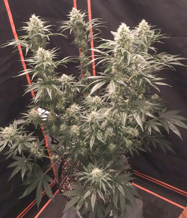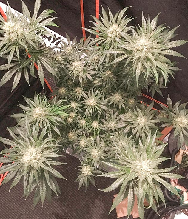 Strawberry Amnesia завершила свой цикл за 15 недель, включая девять недель цветения. Растение получилось образцовым гибридом с преобладанием сативы: длинные ветви, широкие листья и значительное расстояние между узлами. Высота куста составила меньше метра. Четыре соцветия были крупными, хотя и уступали по размеру двум просто гигантским, выросшим на двух основных стеблях. Даже бутоны с нижних ярусов полностью созрели. После сбора я отделил соцветия, тщательно отманикюрил их и высушил в течение шести дней в палатке с хорошей вентиляцией. Итоговый урожай составил 104 грамма.