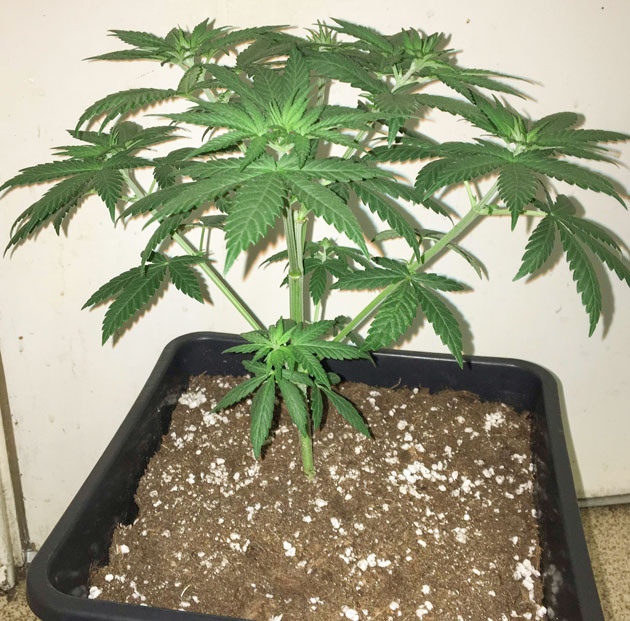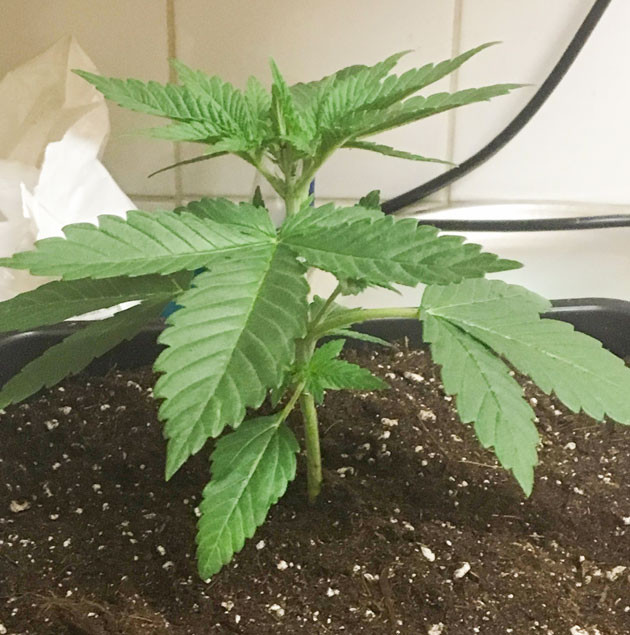 Проращивал традиционным способом, ничего экстравагантного не изобретал. Семечку замочил в воде на 12 часов, затем поместил в «бутерброд» из влажных ватных дисков и положил в зиплок-пакет. Через сутки корешок появился, а через двое суток был длиной около сантиметра. Проросток посадил в литровый стаканчик с землей, добавив 50 мл воды с Katana Roots и Samurai Terra Grow. Прошло три дня с момента посадки, и росток показался из земли, а еще через день сбросил каску. В первые две недели удобрения не вносил, кустик получил только две порции стимуляторов и один раз был полит чистой водой. Пока всё идёт хорошо, за две недели сформировалась первая пара трехпалых листьев и проклюнулся следующий этаж.